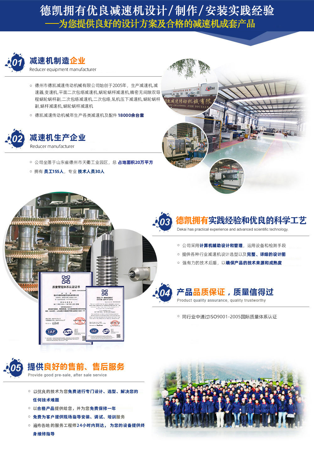 德州市德凱減速傳動(dòng)機(jī)械有限公司,生產(chǎn)減速機(jī),減速器,變速機(jī),平面二次包絡(luò)減速機(jī),蝸輪蝸桿減速機(jī),精密無(wú)間隙雙導(dǎo)程蝸輪蝸桿副,二次包絡(luò)減速機(jī),蝸輪蝸桿,軋機(jī)壓下減速機(jī),蝸輪蝸桿副,蝸桿減速機(jī),蝸輪蝸桿減速機(jī),公司占地面積20萬(wàn)平方,員工155人,技術(shù)人員30人,年生產(chǎn)各類(lèi)減速機(jī)及配件18000余臺(tái)套。在同行業(yè)中通過(guò)了ISO9001質(zhì)量管理體系認(rèn)證。公司設(shè)備齊全、技術(shù)力量強(qiáng)大、檢測(cè)手段完善,引進(jìn)國(guó)外大型數(shù)控二次包絡(luò)機(jī)床GJK75加工數(shù)控4臺(tái),可加工到800二次包絡(luò)蝸輪蝸桿。引進(jìn)漢江S7732蝸桿磨床3臺(tái),精度可達(dá)5級(jí)。公司擁有輝光離子氮化爐4臺(tái),經(jīng)該設(shè)備氮化后可提高蝸桿表面硬度、耐磨性高、提高疲勞強(qiáng)度、變形量小、耐蝕性、...